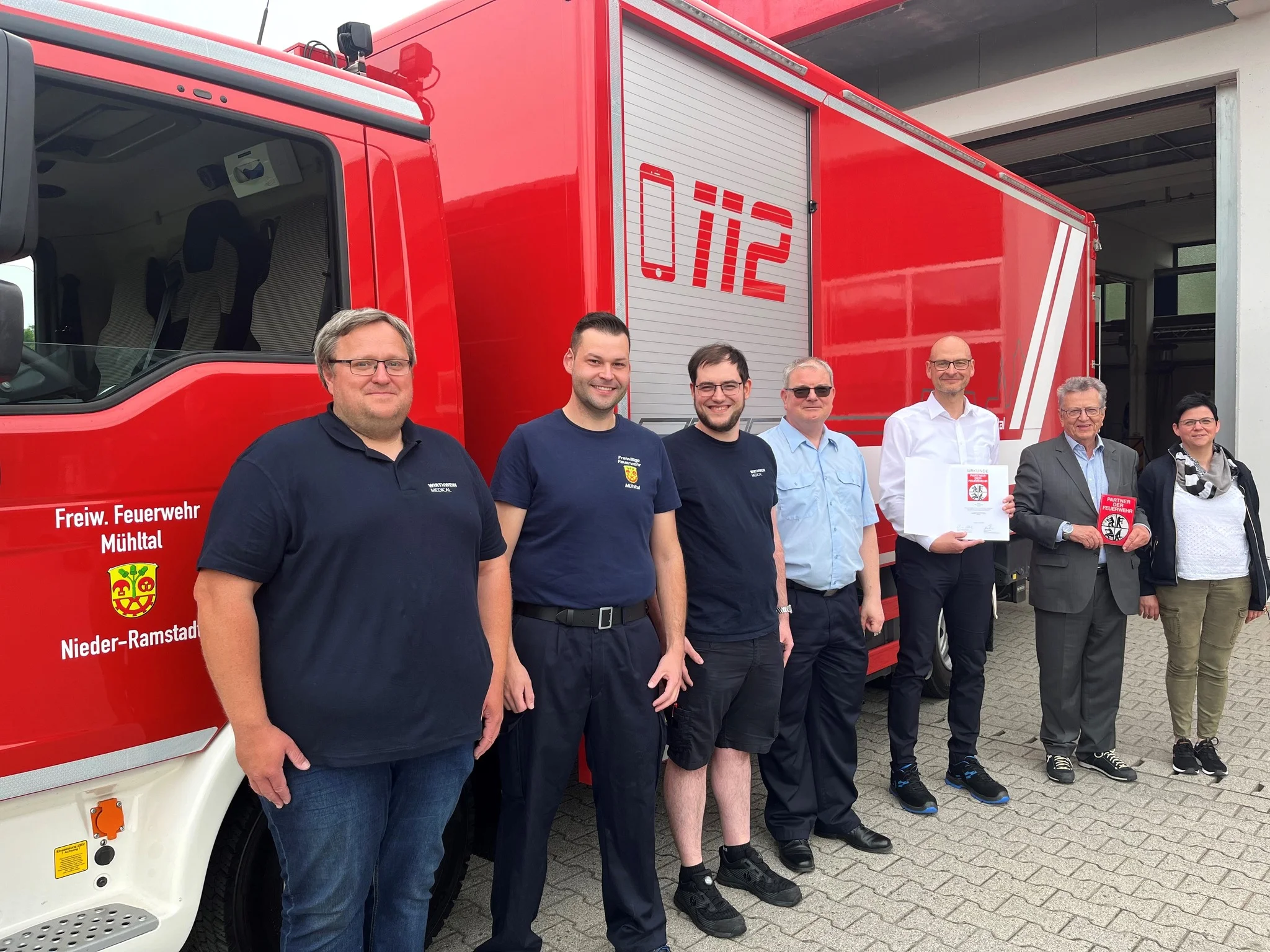 Dominik Kainz (Firma Wirthwein), Nicolas Richter (Wehrführer Traisa), Felix Klein (Firma Wirthwein & Freiwillige Feuerwehr Traisa), Gemeindebrandinspektor Holger Scharkopf, Thorsten Hassenzahl (Firma Wirthwein), Gerd Kabot (REA Card) und Jessica Mertens (REA Card & Freiwillige Feuerwehr Waschenbach )